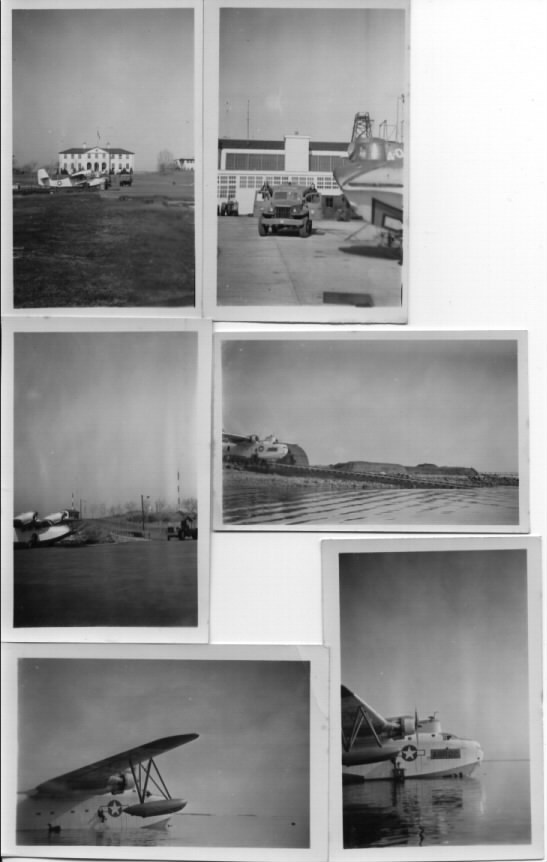 front of the Main Building 17. (right) Tractor and truck alongside the Hangar .. . .. .. . . 18. (left) PBY "Catalina" with radio towers in the background 19. (right) PBM "Mariner" going down the ramp in preparation for a flight . ... 20. (left) Coastie readying a PBM "Mariner" for beaching by attaching floating wheels (dark floating object to the rear of fuselage). These wheels needed to be attached so the PBM could be brought up the ramp and moved around on dry land . 21. (right) PBM "Mariner" with floating wheels attached |